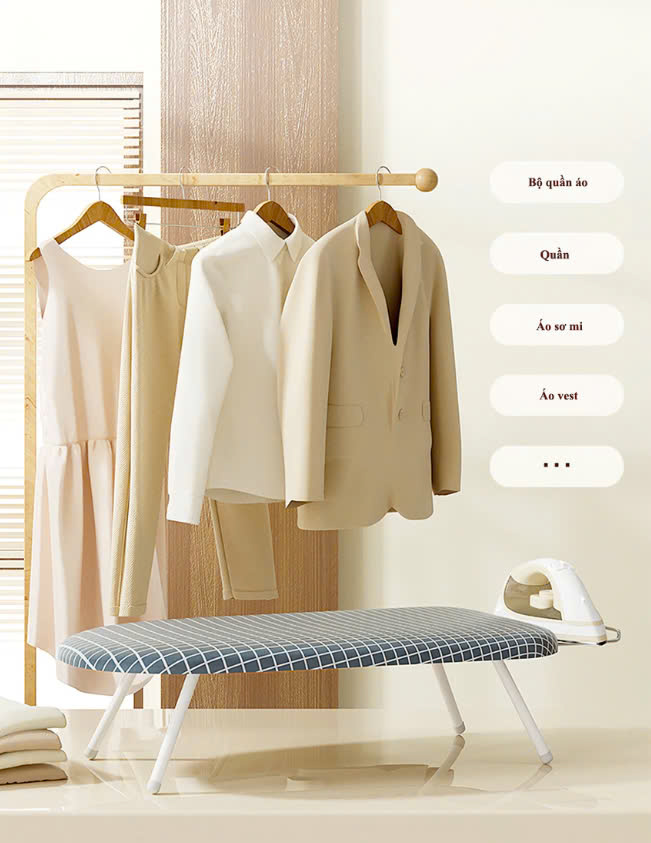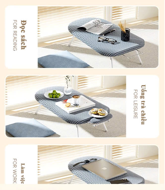 Ngoài việc ủi đồ, bàn gấp gọn này còn có thể dùng làm bàn học, bàn ăn nhanh, bàn làm việc hoặc để laptop – tiện lợi cho không gian nhỏ.