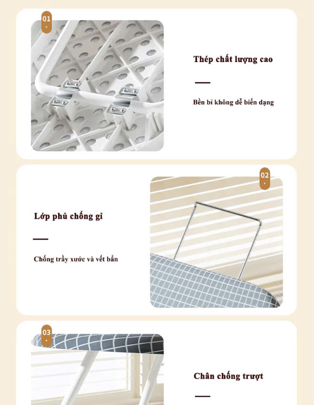 Mặt bàn thoáng khí, ủi phẳng nhanh chóng.