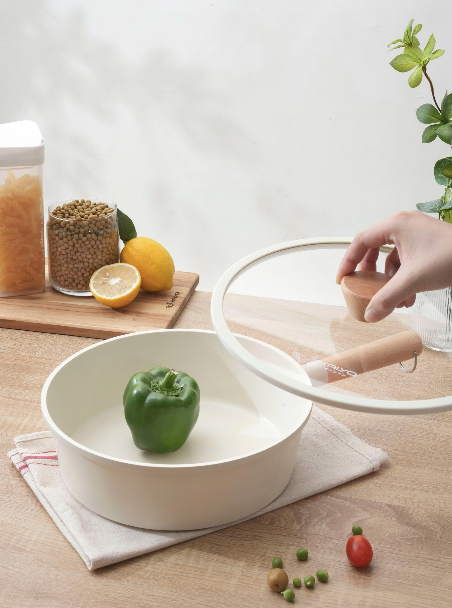 Chảo này đáy dầy đến 4mm nên nấu ăn ngon ko phải nghĩ các c ạ! Chống dính dòng cao cấp của Kaiyo cực an toàn và rất bền ạ! Thiết kế dáng cao dùng đa năng chiên xào nấu đều ổn. Quai cầm có móc treo tiện nữa. E thích nhất vung kính có viền silicon chống va đập, thiết kế quá ưng luôn.