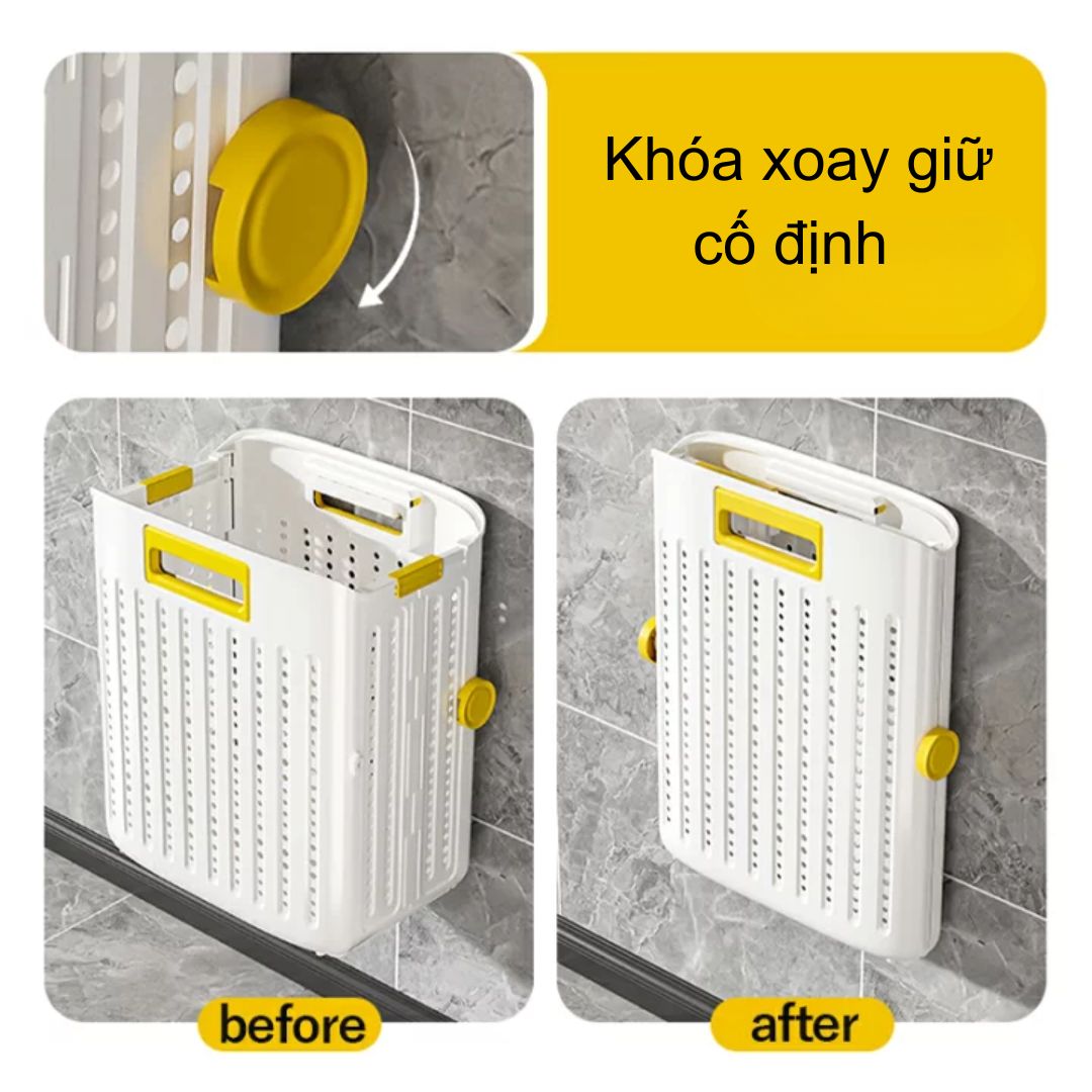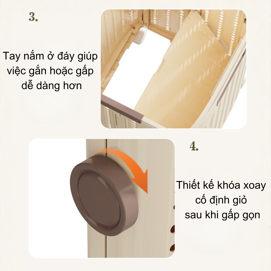 Giỏ có thể mở ra khi cần và gập gọn lại khi không sử dụng, giúp tiết kiệm diện tích tối đa. Khóa xoay giữ cố định đảm bảo giỏ luôn chắc chắn khi mở.