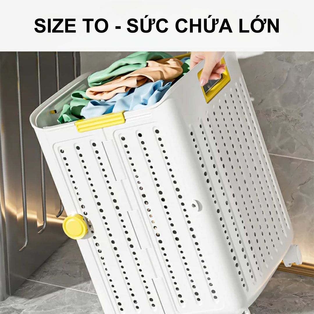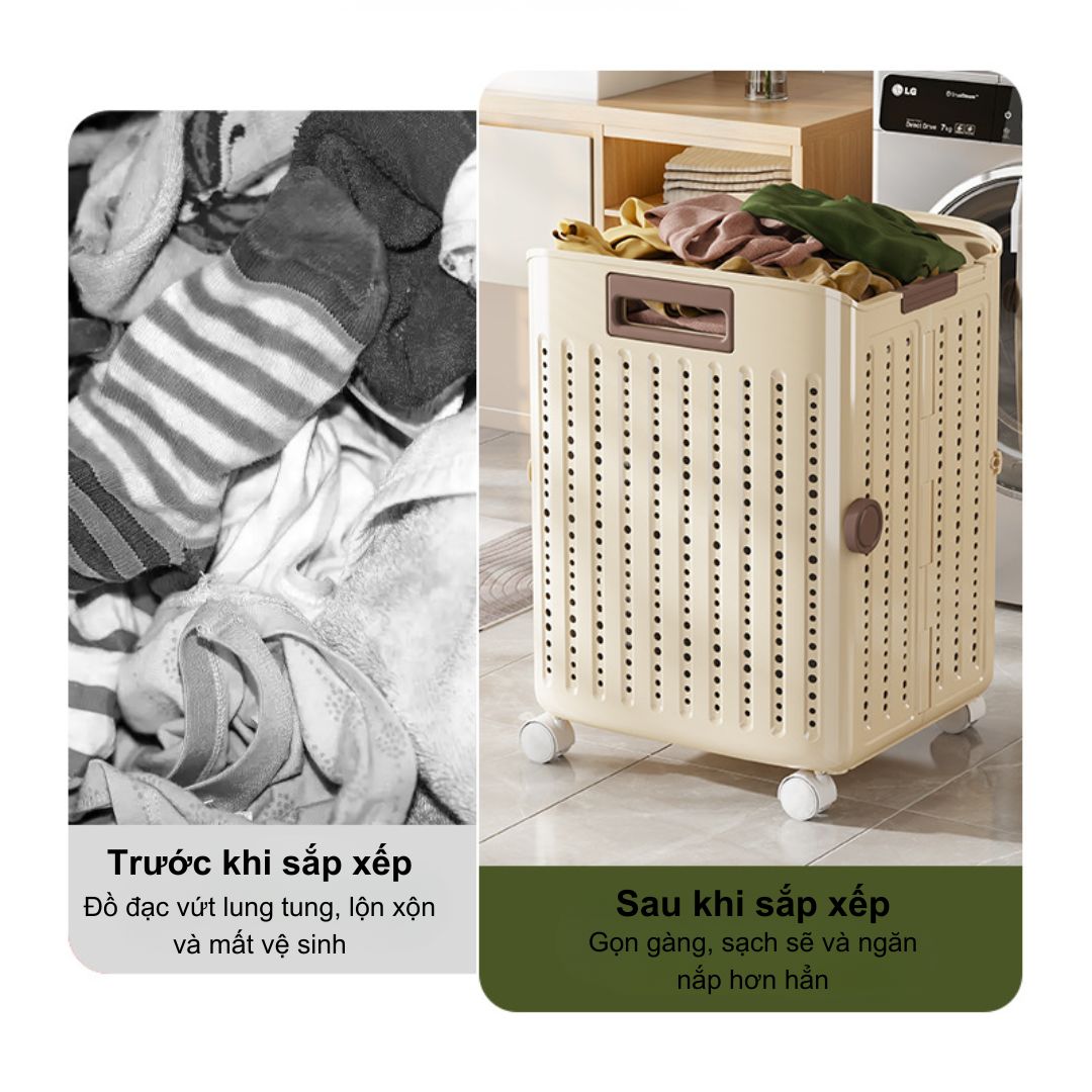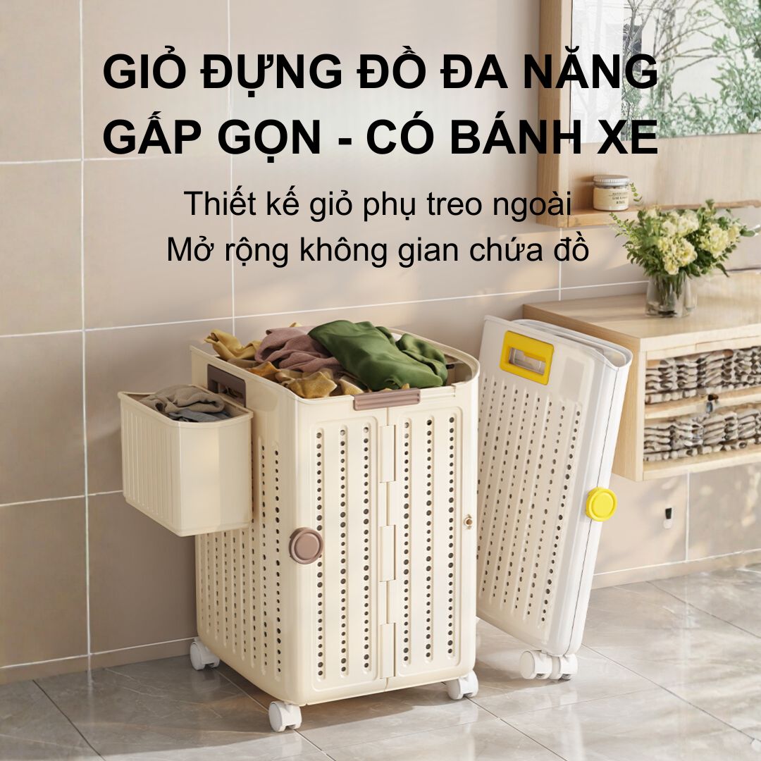 Giỏ đựng gấp gọn có bánh xe là giải pháp thông minh giúp sắp xếp đồ đạc ngăn nắp, gọn gàng trong mọi không gian. Với thiết kế linh hoạt, giỏ có thể dùng để sàn hoặc treo tường, đi kèm bánh xe xoay 360 độ và ngăn mini riêng tiện dụng. Chất liệu nhựa PP cao cấp cứng cáp, chịu lực tốt, không ẩm mốc, phù hợp đựng quần áo, đồ chơi, giày dép hay vật dụng gia đình.
