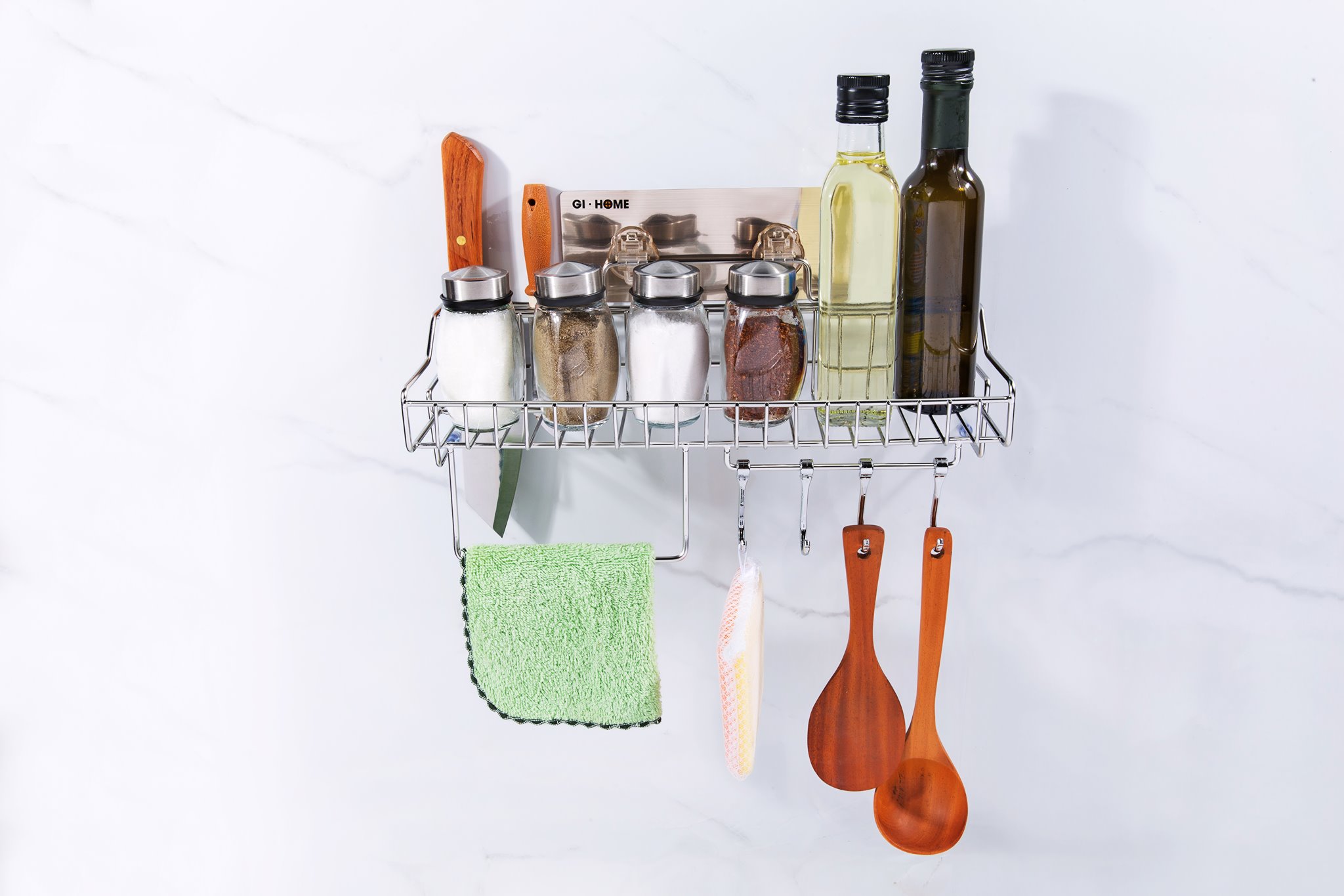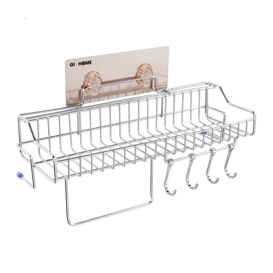 Khay inox 304 cao cấp được thiết kế với sự thông thoáng tối đa cùng lỗ thông khí phía mặt dưới, 2 mặt bên, đảm bảo kệ luôn khô ráo sạch sẽ. Kệ bếp đa năng cao cấp dán tường GI-82420 đa năng 4 trong 1 có thể để gia vị, gài dao, móc treo đồ và máng khăn, giúp nhà bếp của bạn trông gọn gàng hơn.