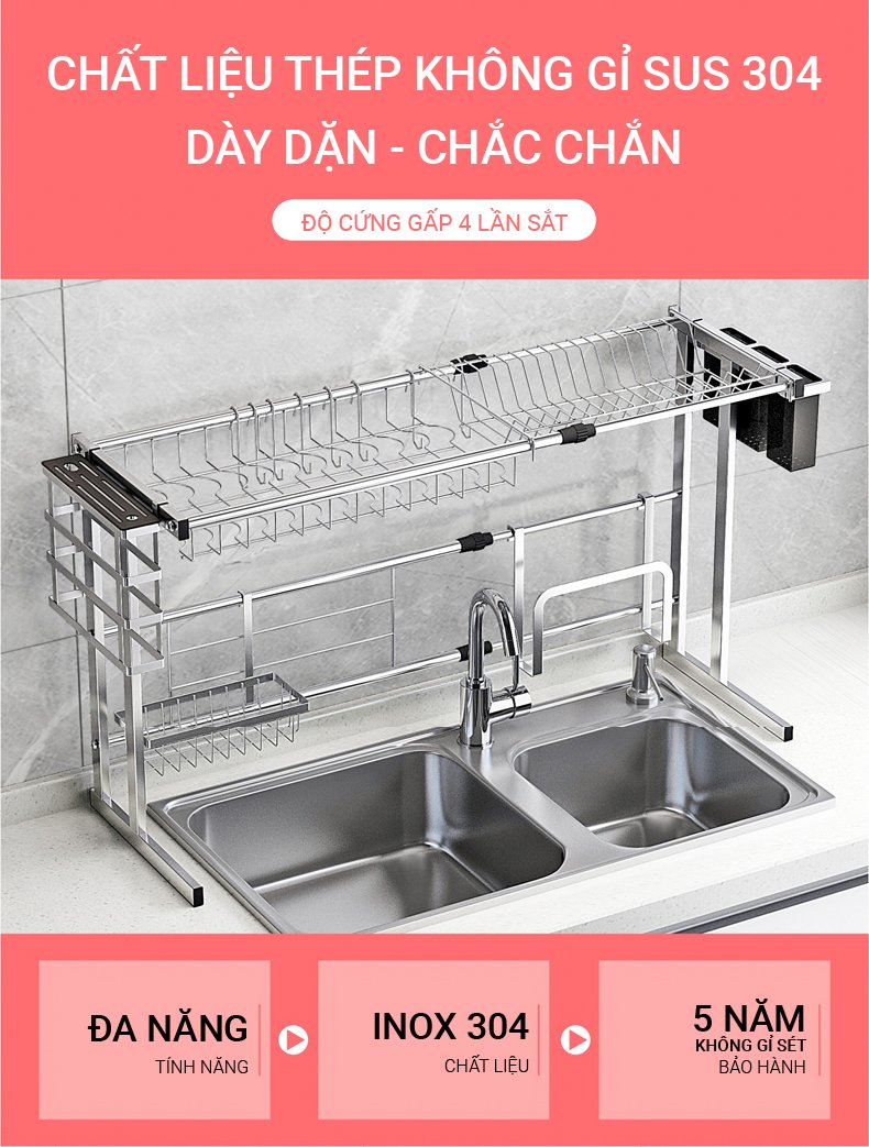 Với Kệ úp bát trên chậu rửa Gi-Home KC18 bạn sẽ không phải lo lắng về việc hoan ố rỉ sét. Sản phẩm được làm bằng inox 304 cao cấp không rỉ sét, sáng bóng theo thời gian, bảo hành chính hãng tới 5 năm.