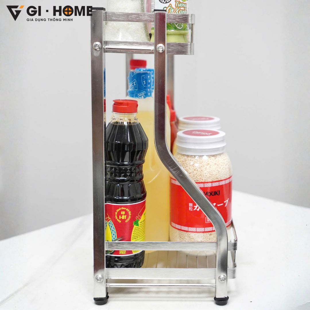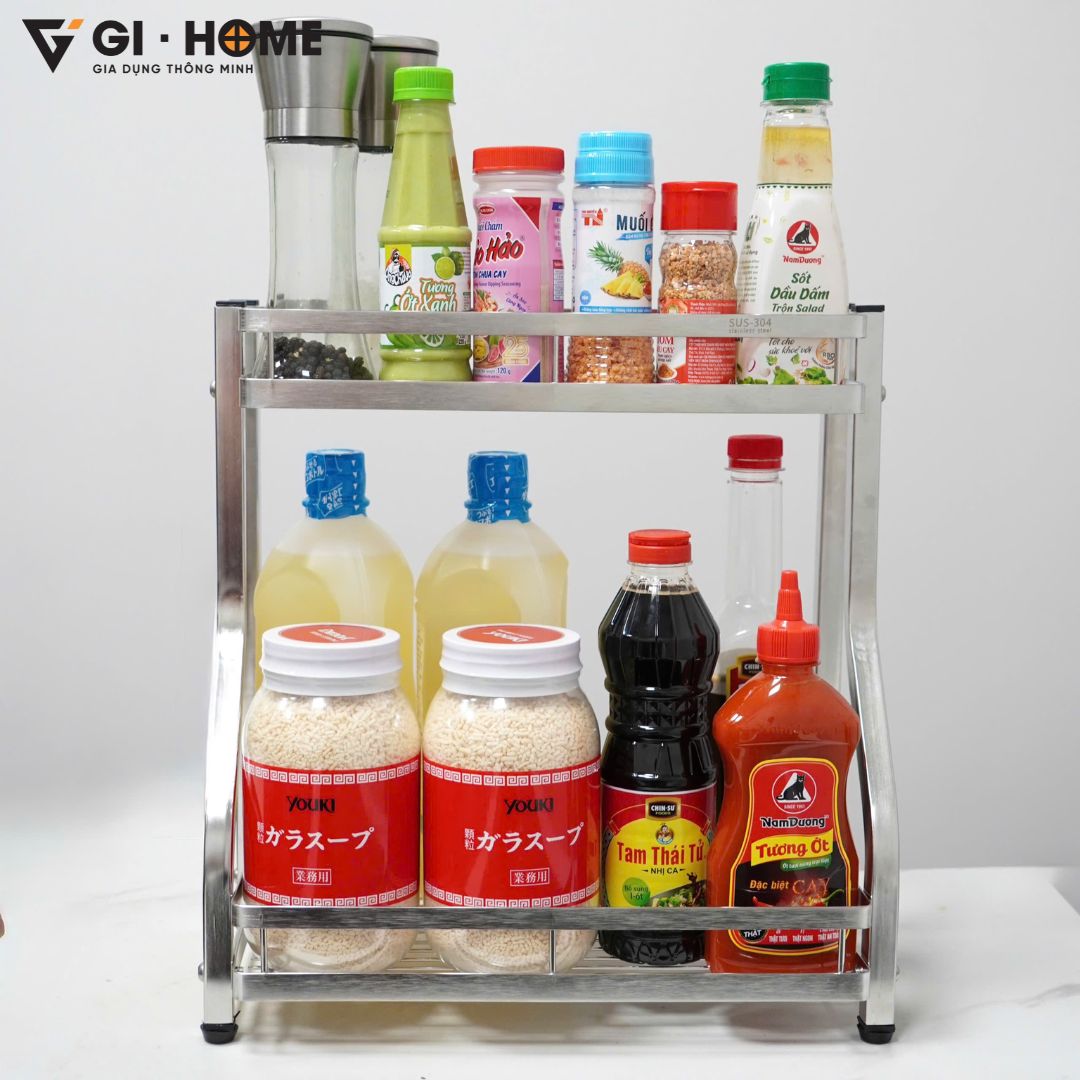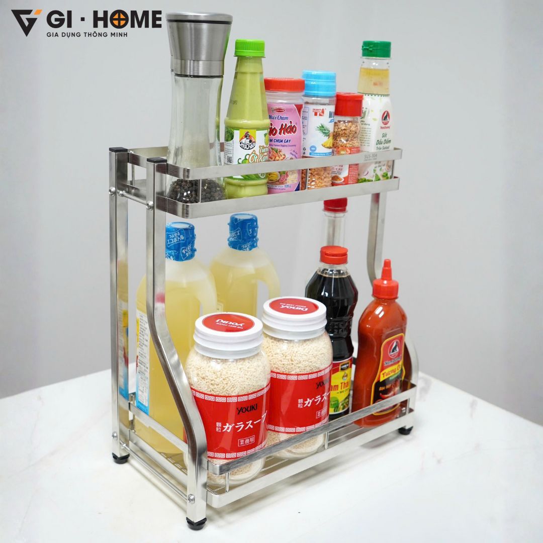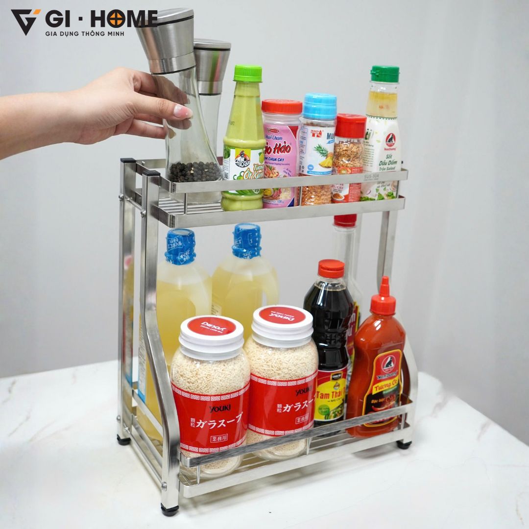 Cấu trúc 2 tầng giúp sắp xếp chai lọ, hũ gia vị một cách khoa học. Ngăn trên để gia vị nhỏ, ngăn dưới đặt chai lớn như dầu ăn, nước mắm – mọi thứ đều ngay ngắn và dễ lấy.