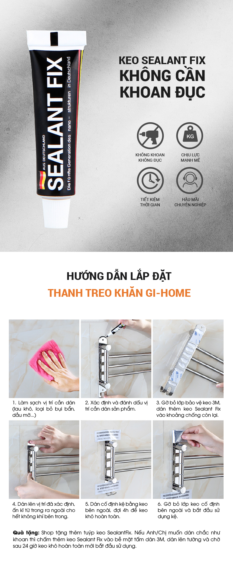 Kệ vắt khăn có thể khoan hoặc dán bằng keo chuyên dụng rất chắc chắn