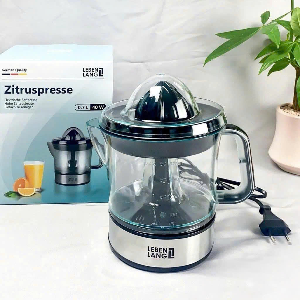 Máy vắt cam Lebenlang LB389 là sản phẩm đến từ thương hiệu Đức, phù hợp cho nhu cầu sử dụng hằng ngày của gia đình. Với dung tích 0.7L và công suất 40W, máy vận hành ổn định, êm ái, giúp vắt nước cam nhanh gọn mà không tốn nhiều điện năng. Thiết kế gọn gàng, chất liệu bền chắc và dễ vệ sinh, phù hợp đặt trong mọi không gian bếp hiện đại.