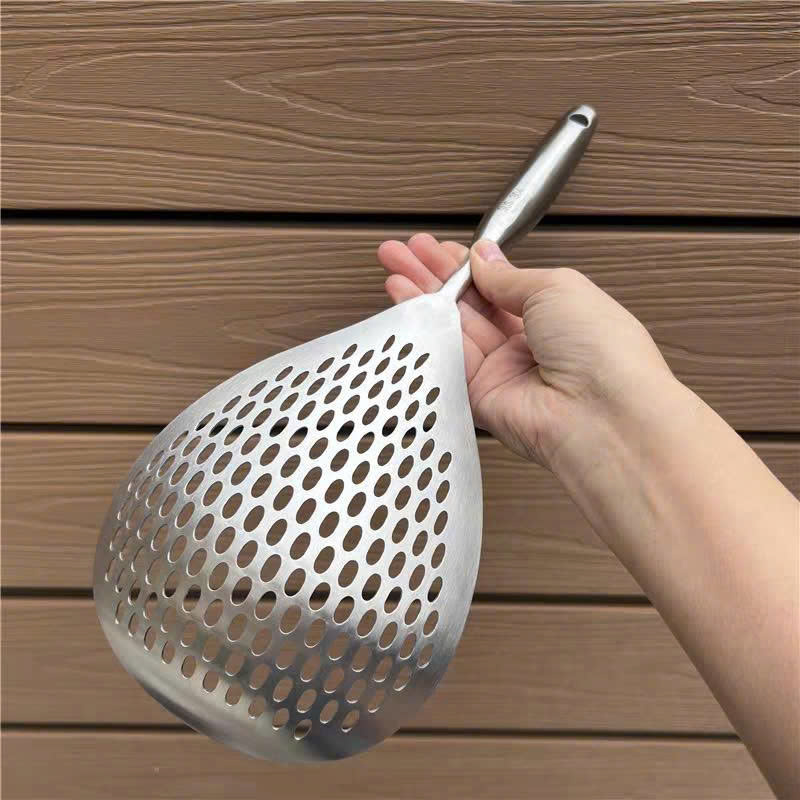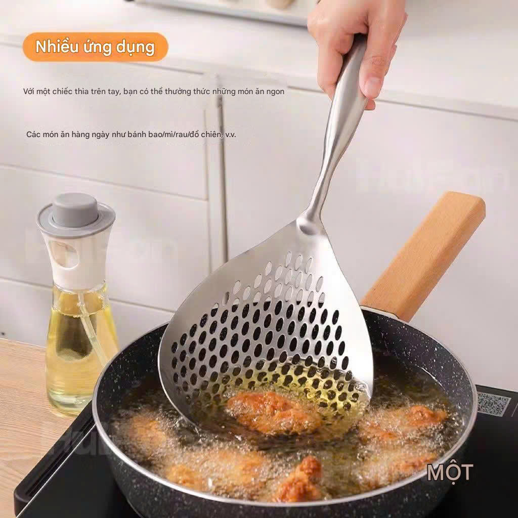 Bề mặt muôi dạng lưới thủng đều giúp dầu mỡ chảy nhanh khi vớt đồ chiên rán, đồng thời hỗ trợ trụng mì, luộc rau gọn gàng chỉ với một thao tác.