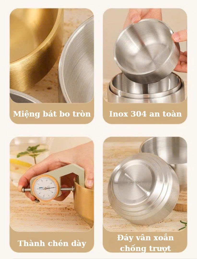 Nhiều loại bát nhựa hoặc bát tráng men sau thời gian sử dụng dễ ngả màu, bám mùi và tiềm ẩn nguy cơ thôi nhiễm khi đựng đồ nóng. Set 5 chén inox 304 đúc nguyên khối là giải pháp an toàn và bền bỉ cho bữa ăn gia đình. Với cấu trúc 2 lớp cách nhiệt, chén giữ nhiệt tốt nhưng vẫn cầm thoải mái, phù hợp dùng hằng ngày cho cả người lớn và trẻ nhỏ.